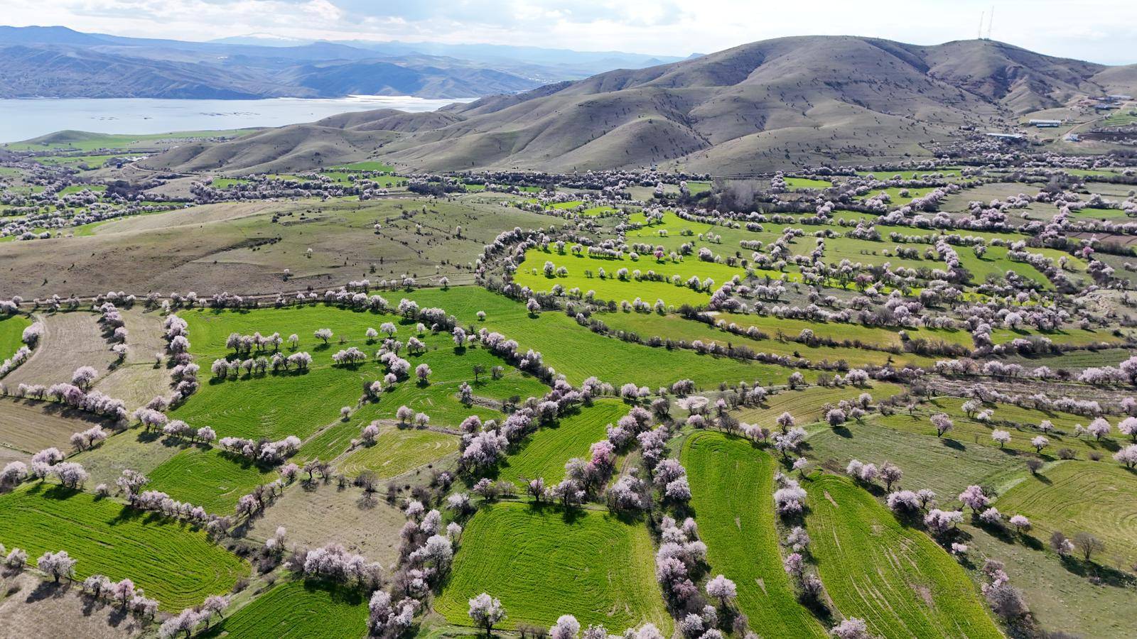 Beyaz ve pembe tonlara bürünen dallar, buğday tarlaları ve Keban Baraj Gölü’nün maviliğiyle birleşerek güzel görüntüler oluşturdu.